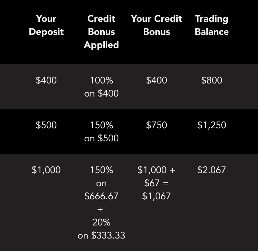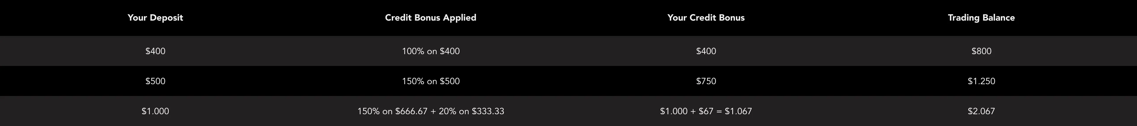 *Any profits generated from closed orders can be withdrawn at any time. However, withdrawing any portion of your original deposit will result in the proportional removal of your credit bonus. Transferring funds between your trading accounts is also considered withdrawal.