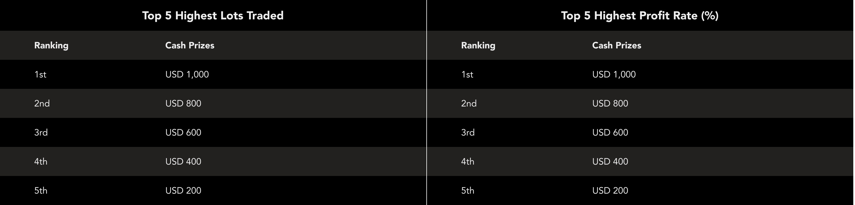 Top Five (5) Signal Providers who have the highest number of lots traded will each be awarded Cash Prizes.
