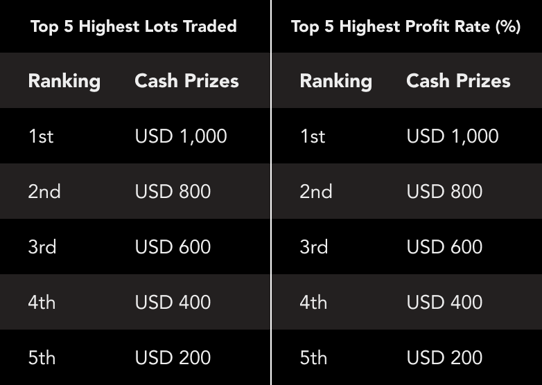 * Profit is calculated by every newly opened and closed orders made during the Competition period. Locked positions, and hedged positions do not count as valid orders for this promotion.