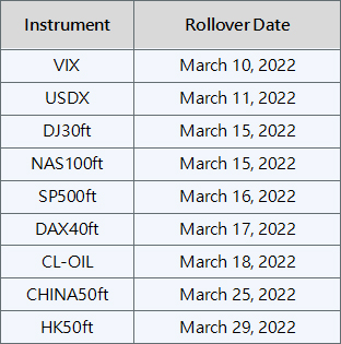 Please be advised that the following CFD instruments will be automatically rolled over as per the dates in the table below. As there can be a pricing difference between old and new futures contracts, we recommend clients to monitor their positions closely and manage positions accordingly.