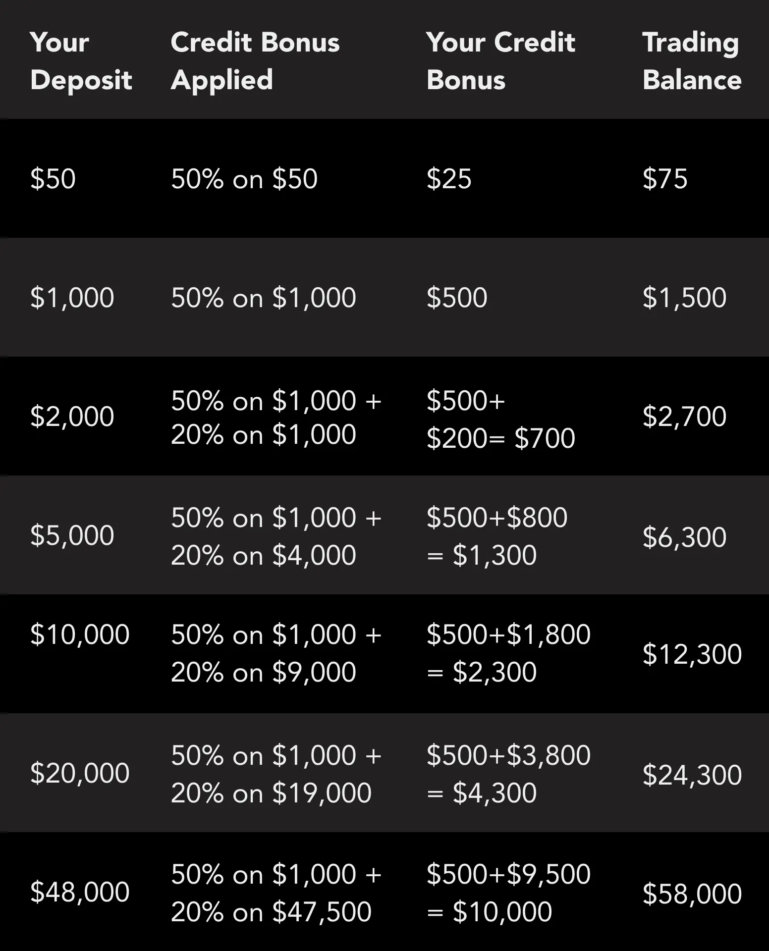 4.Eligible Clients (both new and existing clients), who meet the criteria set forth herein are able to receive credit bonuses or otherwise known as trading credit, equal to: